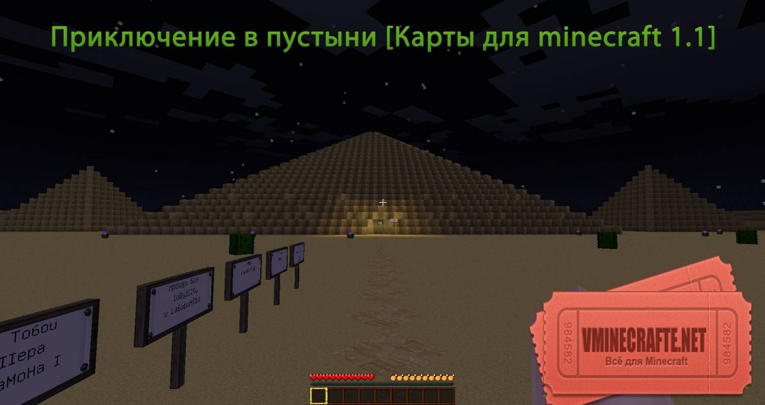 Приключение в пустыни [Карты для minecraft 1.1] - Специально для искателей всевозможных приключений и любителей египетской мифологии создана новая карта по Minecraft 1.1. Называется он «Приключение в пустыни». С самых первых минут игры можно удивляться тому, насколько данная карта проработана до всех тонкостей. По сюжету Ваш персонаж является историком и египтологом, находящимся в поиске разгадок тайны фараона. Первое впечатление от карты захватывает дух, так как Вы появляетесь прямо посреди пустыни, а вокруг Вас высятся памятники древности – пирамиды Египта. В одну из них – гробницу Тутанхамона Вам и предстоит проникнуть в поисках заветного ответа. По карте периодически возникаю таблички с описаниями или подсказками. Весь текст выполнен на русском, но без поддержки кириллицы, поэтому смотрится не совсем корректно, но читать можно. За входом в пирамиду Вас ожидают длинные коридоры лабиринтов, каждый уголок которых таит в себе много смертельных опасностей и ловушек, попав в которые, Вам трудно будет выбраться. Автор карты приготовил Вам столько замысловатых испытаний, что они порой кажутся непреодолимыми. В общем, карта весьма непроста для прохождения, но это компенсируется постоянной сменой декораций. С одной стороны со стен вылетают стрелы, с другой поршни норовят сбросить Вас в потоки лавы. А еще тут таится множество всяческих кнопок, которые и активируют те или иные механизмы и ловушки. Тщательность проработки деталей действительно поражает. Здесь все просчитано таки образом, чтоб не оставить игроку возможности заскучать. Одним словом, честь и хвала создателю такой интересной и увлекательной карты. Благодаря такому чудесному набору преимуществ карта «Приключения в пустыне» сразу после появления произвела настоящий фурор в мире ценителей майнкрафта.